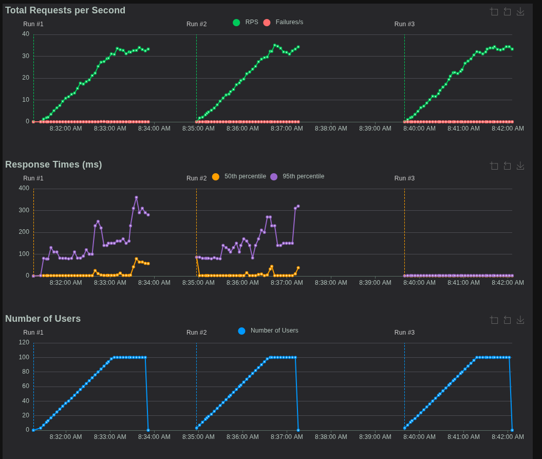 Interestingly, this occurred between 25 and 27 Requests per Second (RPS) and then didn't reappear. This could have been an isolated incident and might be attributable to my not specifically configured API hosting hardware.